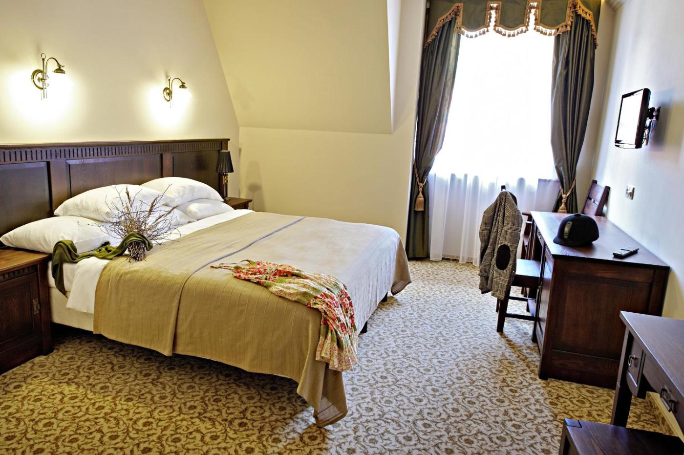 Pokój Dwuosobowy z 1 lub 2 łóżkami. Jest to elegancki, klasycznie urządzony pokój z drewnianymi meblami. Pokój Dwuosobowy z 1 lub 2 łóżkami - 3 osobowy. Powierzchnia pokoju ok.: 18 mkw. ;