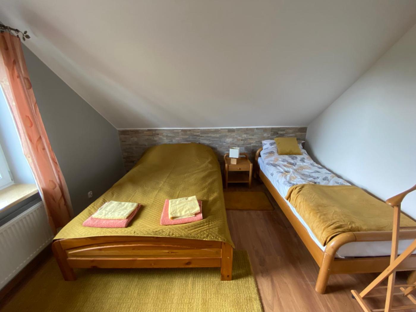 Apartament z tarasem. This apartment comprises 2 bedrooms, kitchen, a terrace and 1 bathroom with a shower. Guests will find a stovetop, a refrigerator, kitchenware and a microwave in the kitchen. The apartment also provides guests with a barbecue. The apartment provides a tea and coffee maker, a dining area, a wardrobe, a flat-screen TV with satellite channels, as well as garden views. The unit offers 3 beds. Apartament - 4 osobowy. Powierzchnia pokoju ok.: 56 mkw. ;